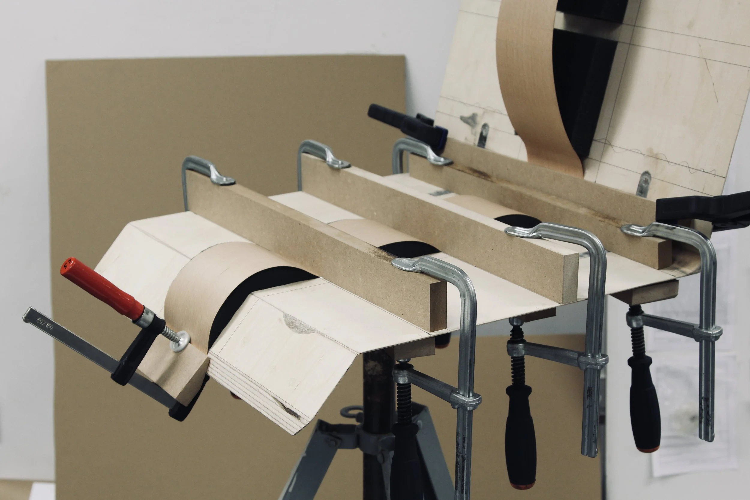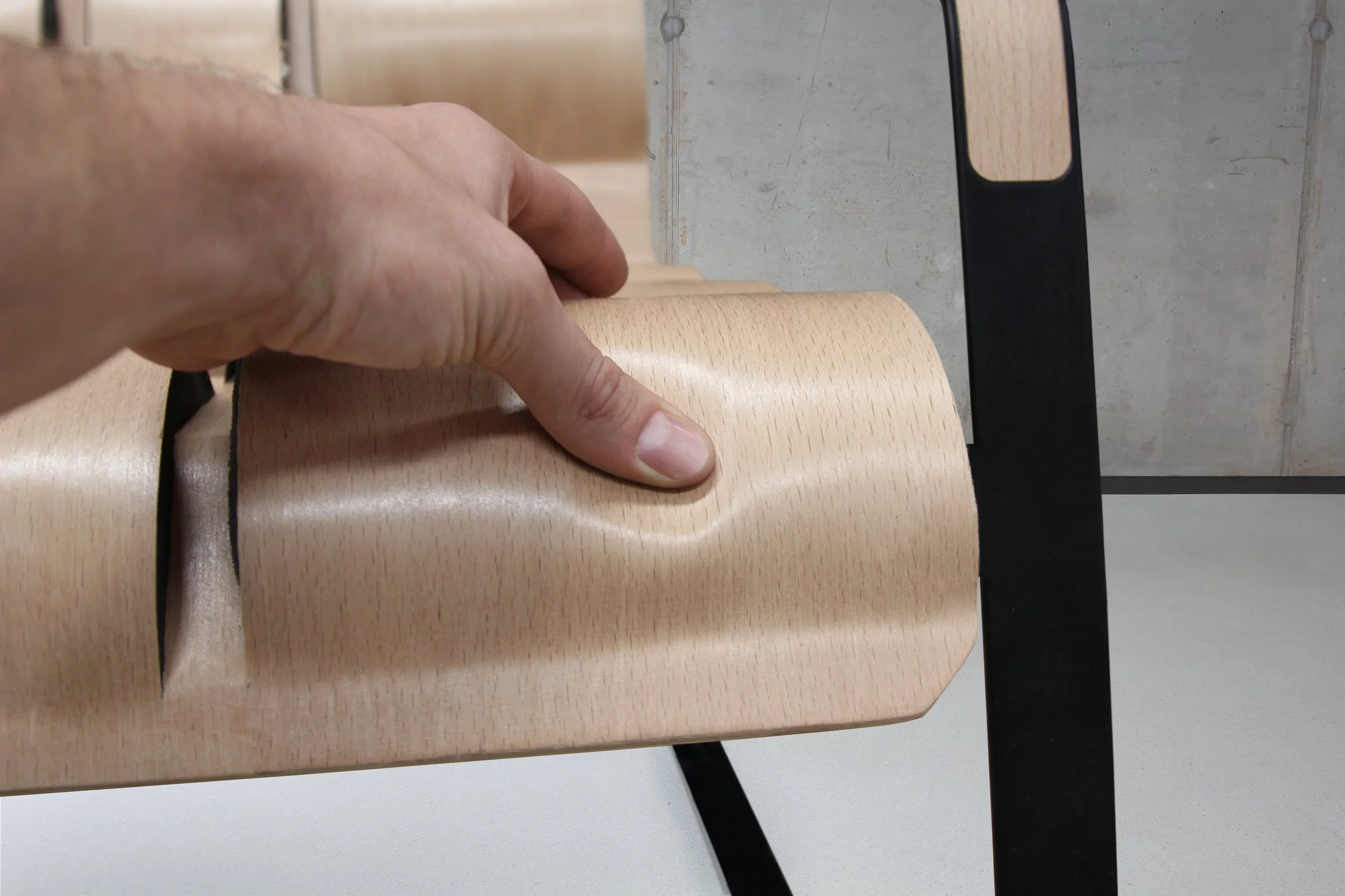 Vergangenes Jahrhundert hat sich das Verkleben von Schichtholz gegenüber der Verwendung von Vollholz bewehrt. Großer Vorteil neben der Stabilität ist die Verformbarkeit. Aufbauend darauf wurde 3D-Furnier entwickelt, welches sich in zwei Achsen gleichzeitig verformen lässt. Ich habe diese und weitere Methoden nachgestellt, um das Material besser zu erfahren. Ziel war, die Flexibilität von Holz dauerhaft zu erhalten, um neue Anwendungsfelder zu eröffnen. Hartschale und Überzug meines lounge chairs bestehen aus gleichem Holz.
