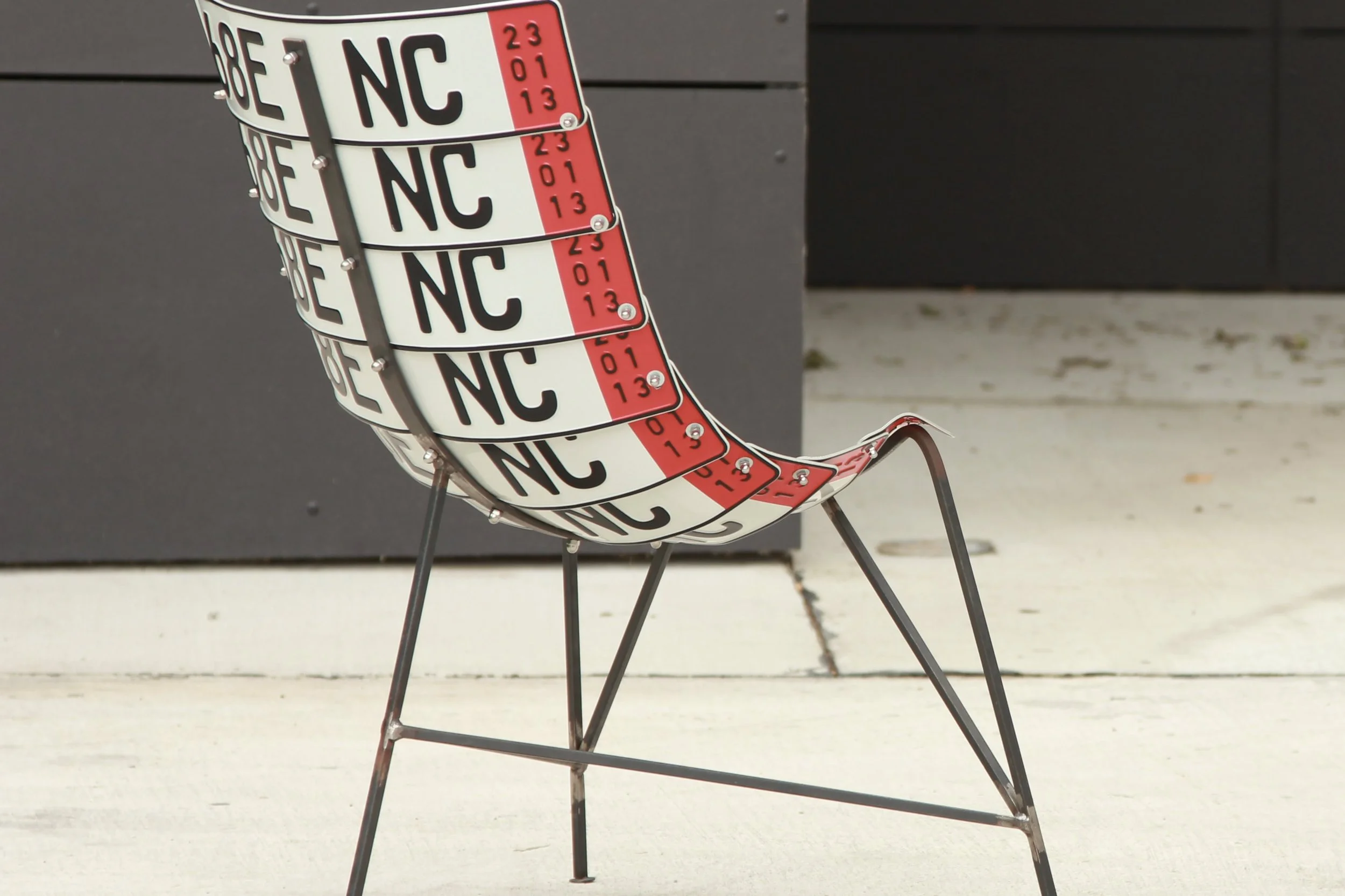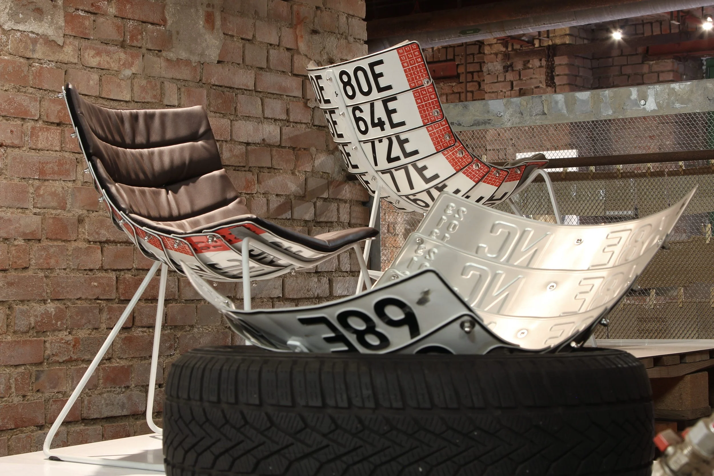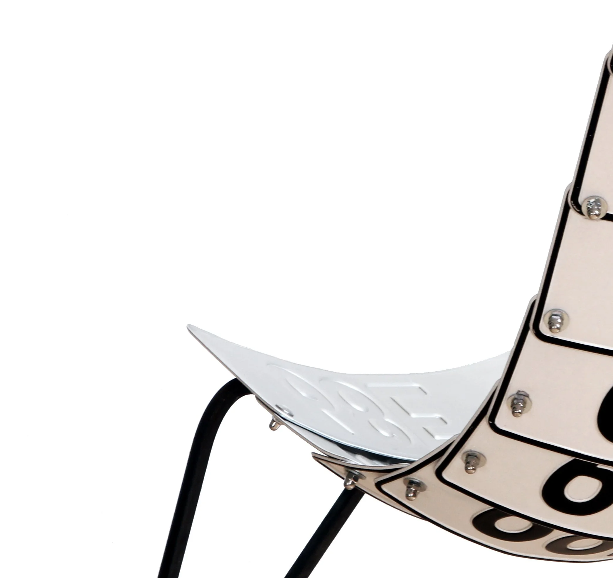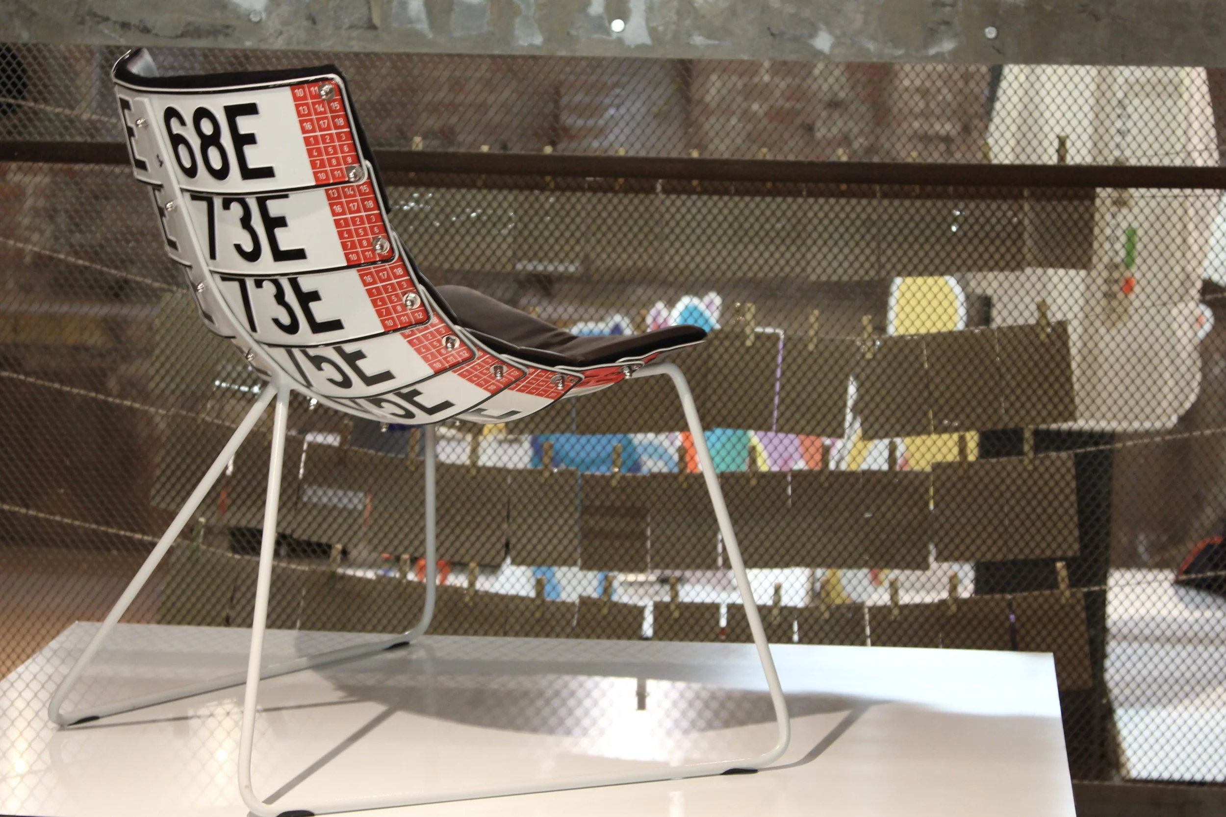 Under the pseudonym Upcycling, I discovered used temporary license plates at a scrapyard—items whose recycling is both complex and harmful to the environment. I was so fascinated by their typography and aesthetics that I decided to repurpose them. Upon further observation, the way I arranged the plates reminded me of the structure of a beetle’s carapace, leading me to fan them out accordingly. Their slight curvature naturally formed a shell-like shape, from which a unique seat emerged—giving new value to discarded material.