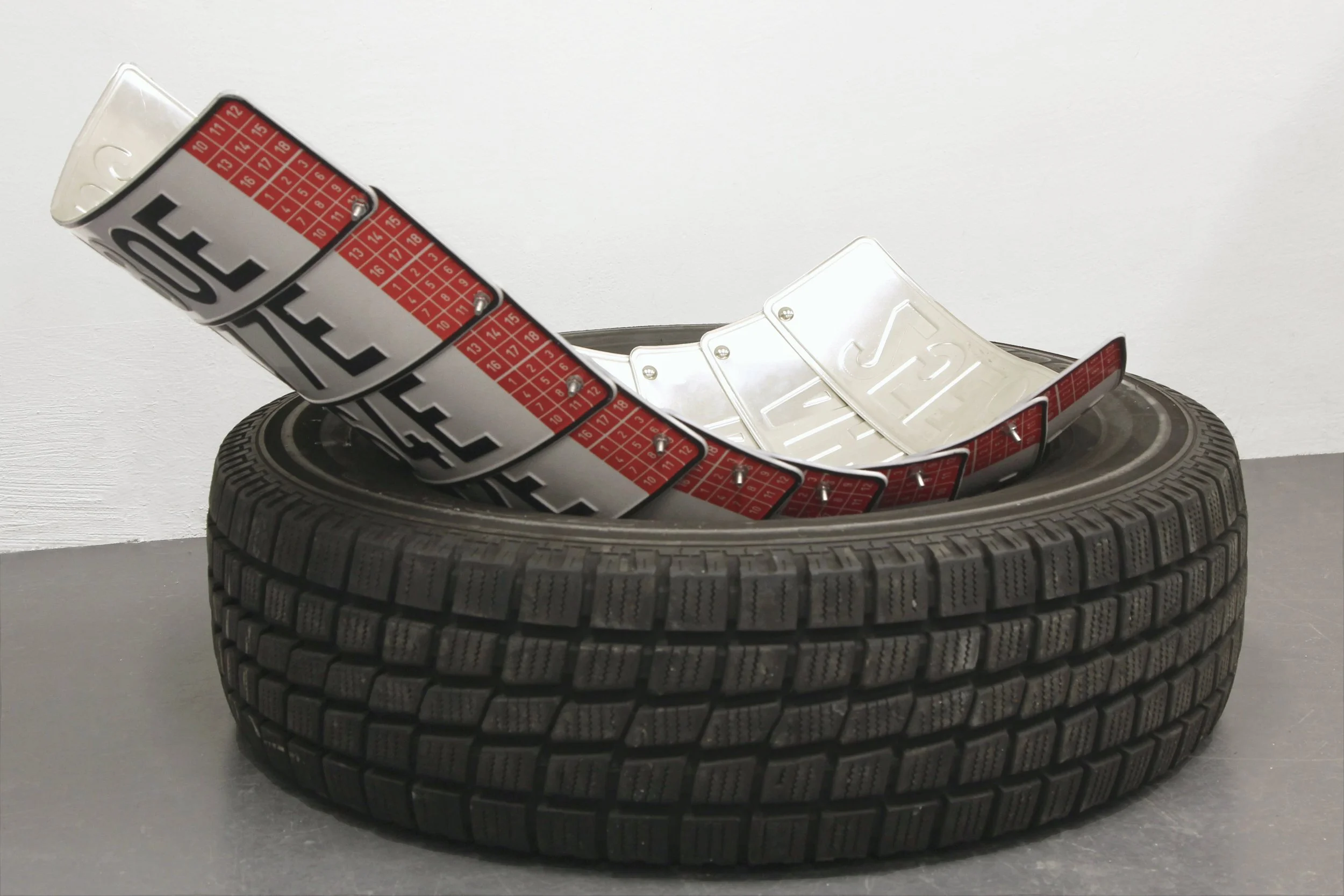 Unter dem Pseudonym Upcycling entdeckte ich gebrauchte Überführungskennzeichen auf einem Schrottplatz, deren Recycling aufwendig und umweltschädlich ist. Ihre Typografie und Ästhetik war so faszinierend, dass ich diese Schilder nutzen wollte. Beim späteren Betrachten assoziierte ich den Aufbau eines Rückenpanzers von Käfern, indem ich die Schilder fächerte.