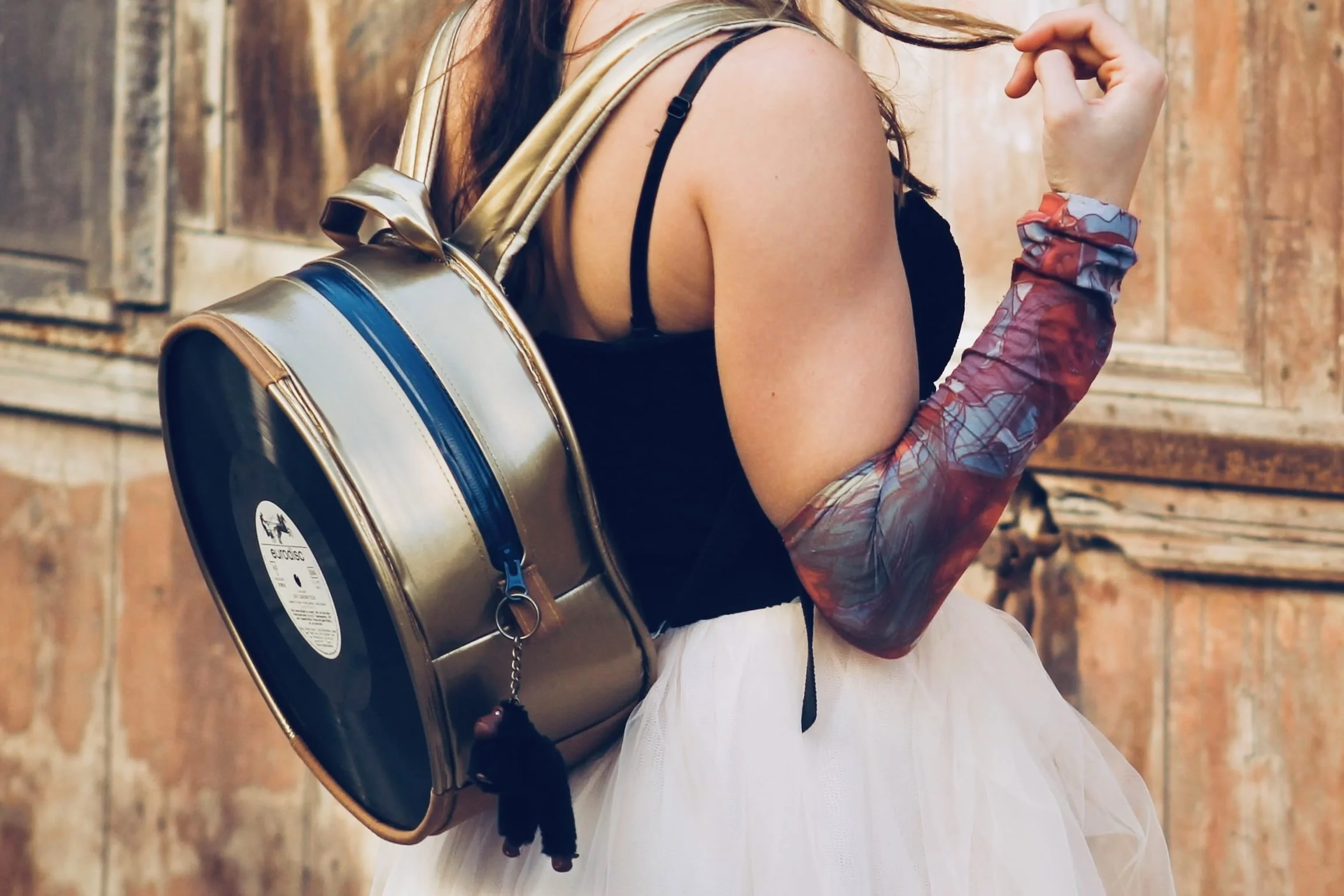 Musik ist eines der beruhigendsten und wichtigsten Ausdrucksmittel der Kunst. Sie begleitet uns täglich und lenkt unser Bewusstsein. Dies wollte ich in ein Alltagsprodukt integrieren. Auf einem Flohmarkt in Berlin betrachtete ich alte Schallplatten, und so entstand die Idee für Sputnik. Ich nähte diesen Rucksack, dessen Stoff ich aus speziellen Materialien verklebte und dadurch verstärkte, in der Form eines Klangkörpers, damit er als Resonanzraum für den eingesetzten Lautsprecher dienen kann.