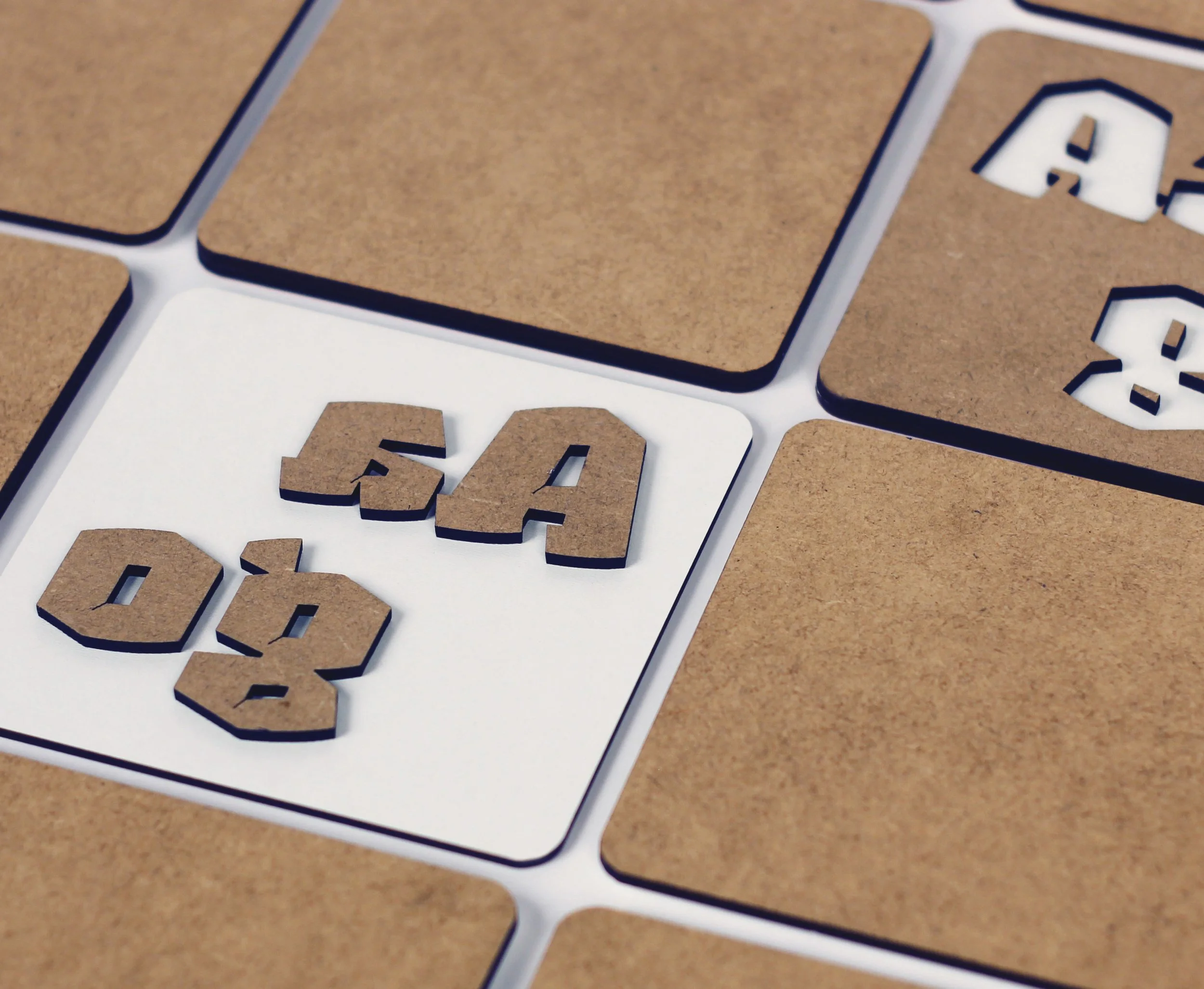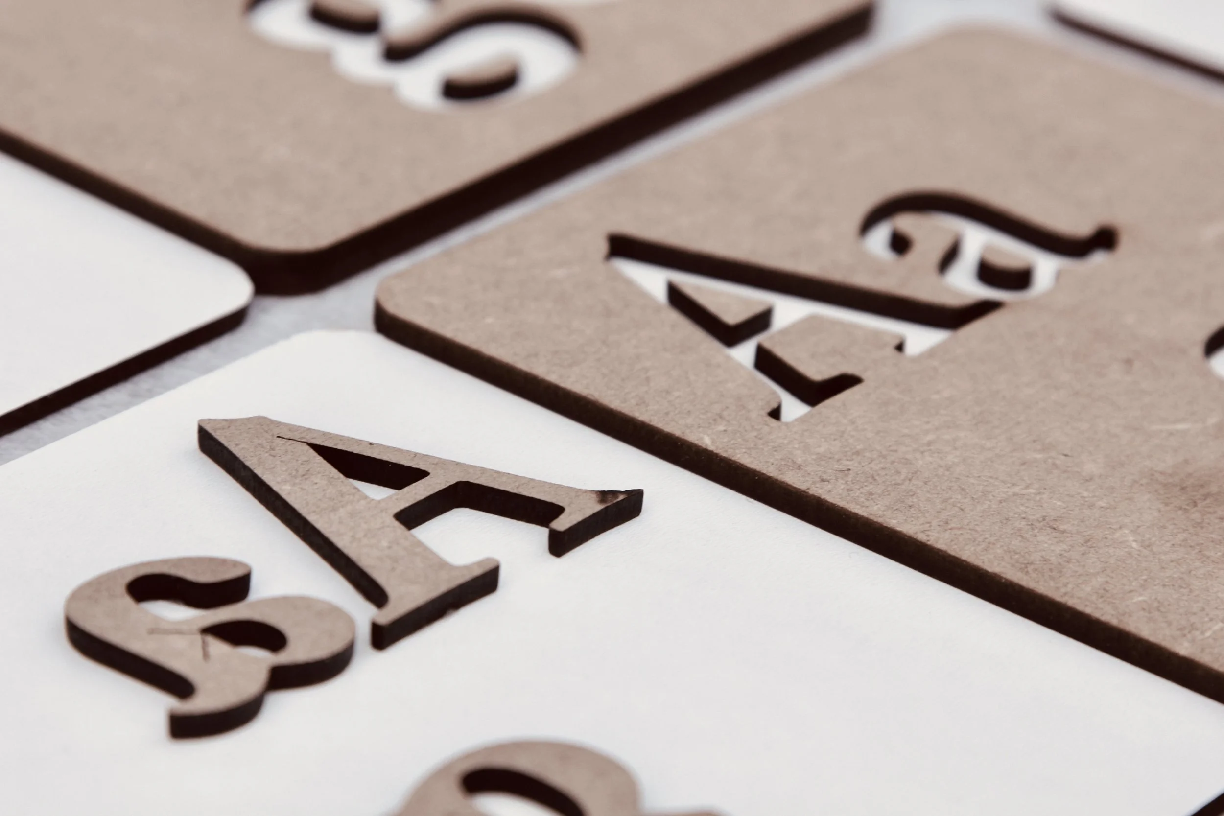 Um den Blick für typografische Elemente zu schulen, wurde uns das Thema „memory“ vorgegeben. Um ein Spiel daraus zu machen suchte ich nach der Möglichkeit, Ergebnisse prüfen zu können, da sich einige unserer Schriftarten nur durch minimale Änderungen unterschieden. So entstand ein Memory, bei dem es eine negativ und eine positiv gelaserte Karte gibt, welche durch ineinanderfügen geprüft werden kann.
