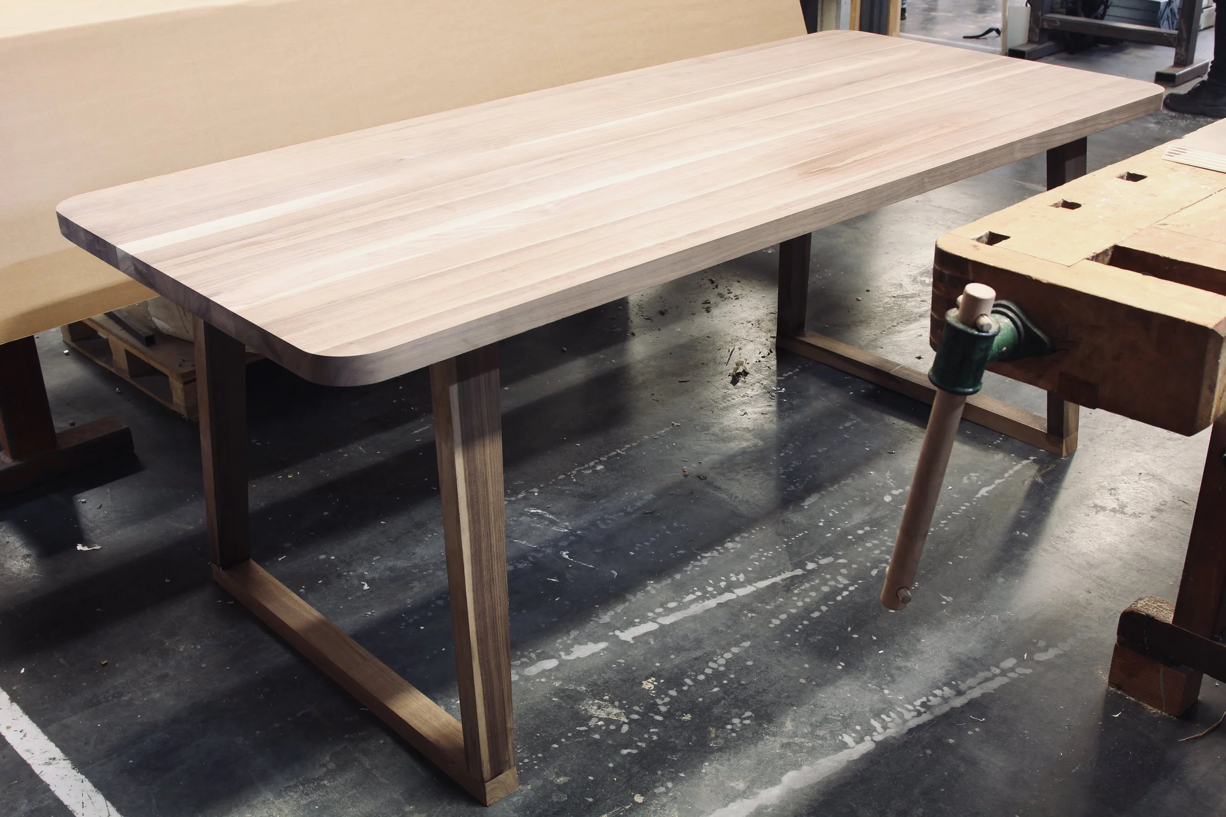 Ich bin kein gelernter Schreiner, habe dafür aber viel Erfahrung mit Holzarbeiten gesammelt und wollte meine Erfahrung in diesem Bereich einmal voll und ganz umsetzen und einen Tisch aus rohen Bohlen herstellen, um die gängigsten Prozesse der manuellen Holzverarbeitung zu durchlaufen. Die Gestalt sollte sich zeitlos einfügen, wobei Rundungen erwünscht wurden. Die Beine sind durch sechs Schrauben leicht demontierbar und ergeben ein einfaches, stabiles Trapez. Die fertige Garnitur fügt sich nun feurig leuchtend und doch bodenständig in den Innenraum ein.